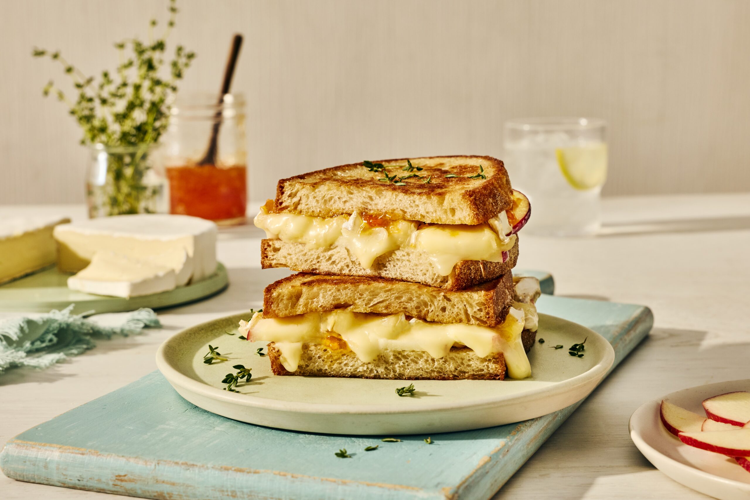 If you’re looking for the best grilled cheese recipe, this sweet and savory sandwich is about to become your new favorite. Skip the bacon and ham this time — this simple brie grilled cheese proves that only a few ingredients can make the best grilled cheese sandwich. Made with rich and creamy alouette Double creme brie, a sweet spread of apricot jam, mayonnaise, crisp sliced apples, golden sourdough bread and garnished with savory thyme leaves, this delightful sandwich is grilled to perfection. It is the ultimate upgrade to the classic grilled cheese, a staple comfort food. You can use variations of pairings and substitute apricot jam for another fruity spread like blackberry, or fig, if you’re looking for a more deep or savory bite. Even switching out crisp apples, for juicy pears and finishing with a little balsamic drizzle to add a little tang makes this sandwich a great option for every taste profile. The variations and brie cheese will take this to the next level beyond the typical cheddar. Try making your own version at home for gourmet flavor with minimal effort, and the flavors will be sure to make your taste buds sing. Once you try it you’ll see why brie and fruit are such a classic combination.